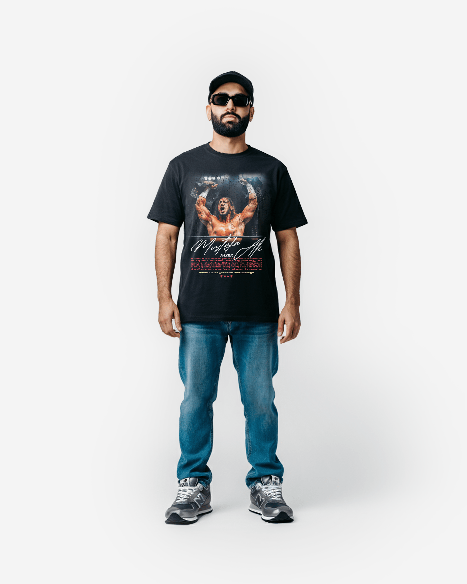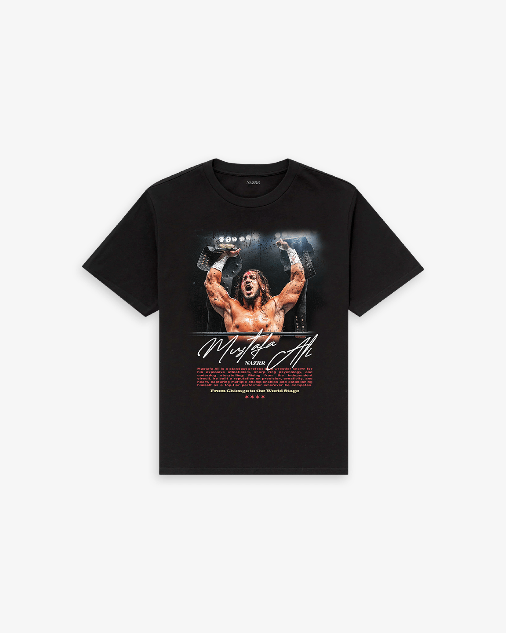 • MUSTAFA ALI WRESTLER TEE. THIS GRAPHIC CAPTURES MUSTAFA ALI IN CHICAGO, HOLDING TWO CHAMPIONSHIP BELTS, SYMBOLIZING HIS ACHIEVEMENTS AND THE CITY THAT SHAPED HIS JOURNEY. THE RED TEXT ON THE SHIRTS READS: MUSTAFA ALI IS A STANDOUT PROFESSIONAL WRESTLER KNOWN FOR HIS EXPLOSIVE ATHLETICISM, SHARP RING PSYCHOLOGY, AND UNDERDOG STORYTELLING. RISING FROM THE INDEPENDENT CIRCUIT, HE BUILT A REPUTATION ON PRECISION, CREATIVITY, AND HEART, CAPTURING MULTIPLE CHAMPIONSHIPS AND ESTABLISHING HIMSELF AS A TOP-TIER PERFORMER WHEREVER HE COMPETES.'